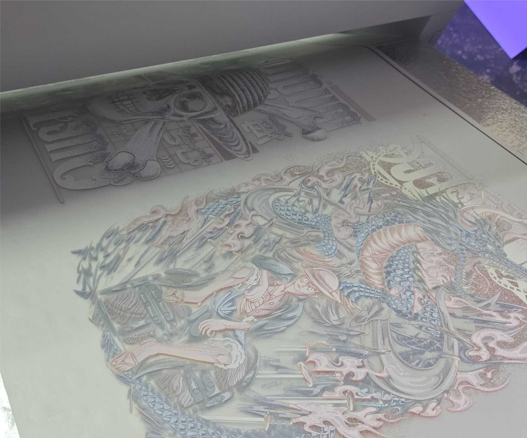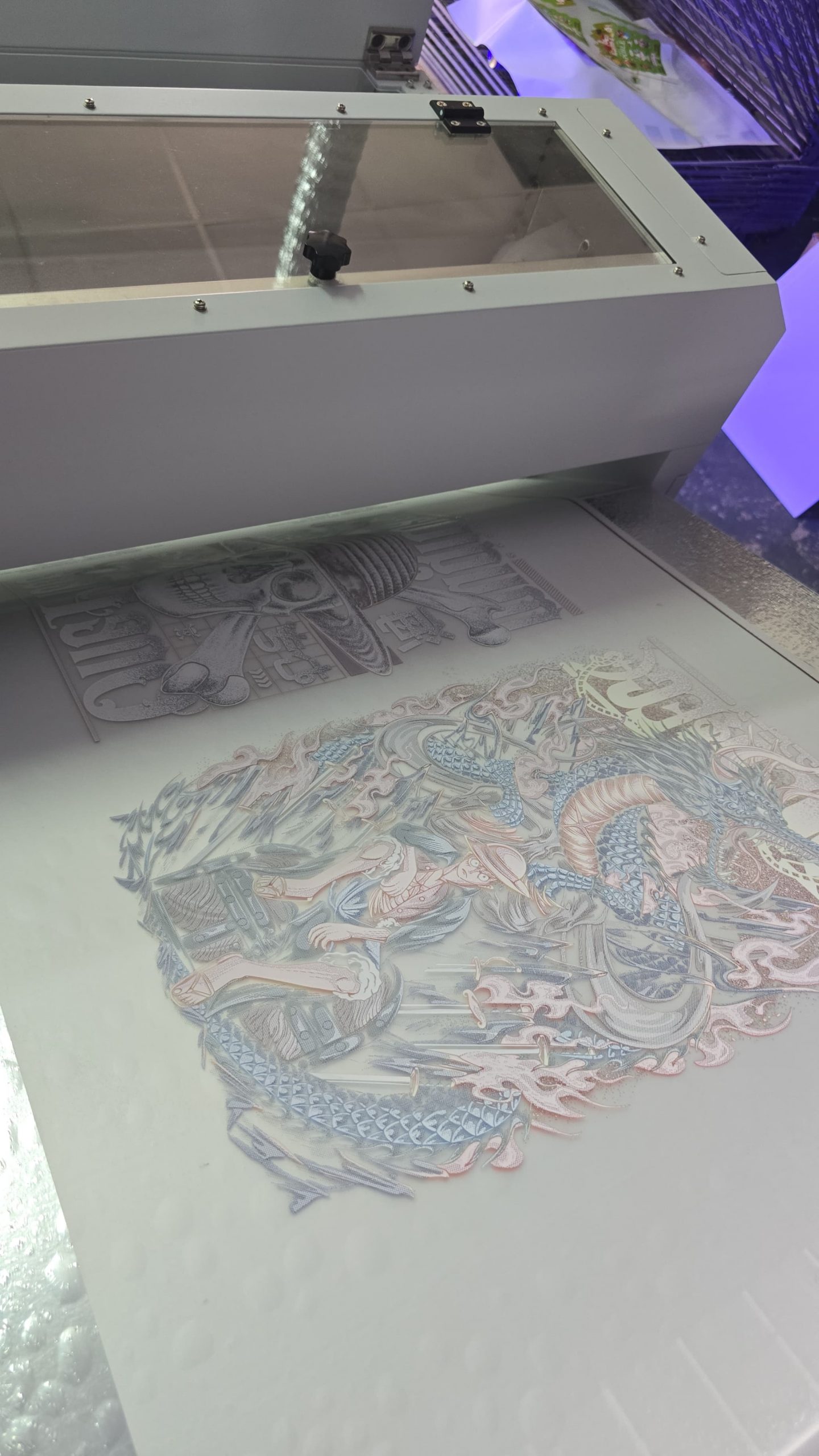 - Una vez impreso el diseño en la película, se aplica un polvo adhesivo especial sobre la tinta aún húmeda.